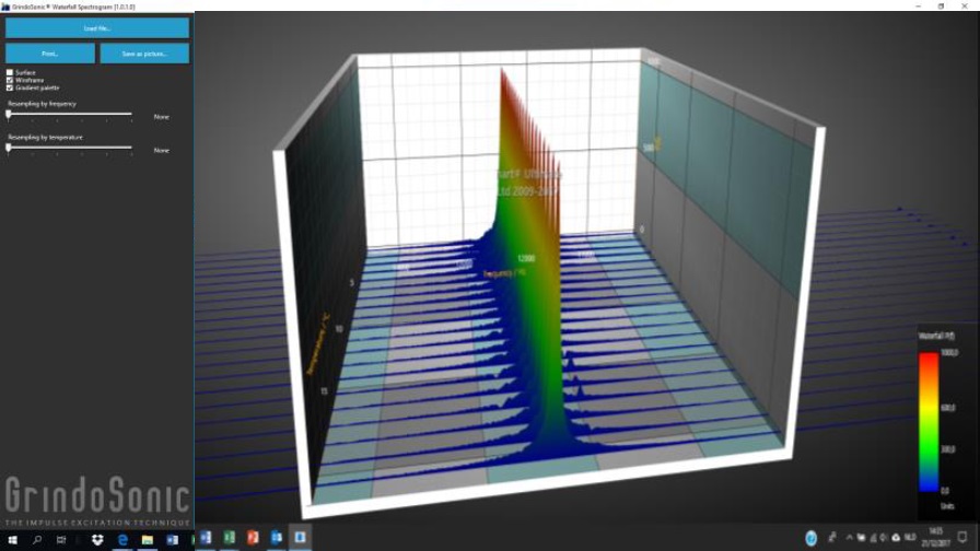 全天的瀑布圖可以方便、全面、清晰地顯示彎曲頻率峰值的分布(這與材料質(zhì)量密切相關(guān))和該峰值的寬度(=阻尼,與產(chǎn)品中是否存在裂紋密切相關(guān))。此外,完整的頻率特征(頻譜)可以繪制在瀑布圖中,以提供一天生產(chǎn)中零件頻率變化的概述(或者如果希望更長的時間,可以自由定義時間間隔,例如一周、一個月…)。